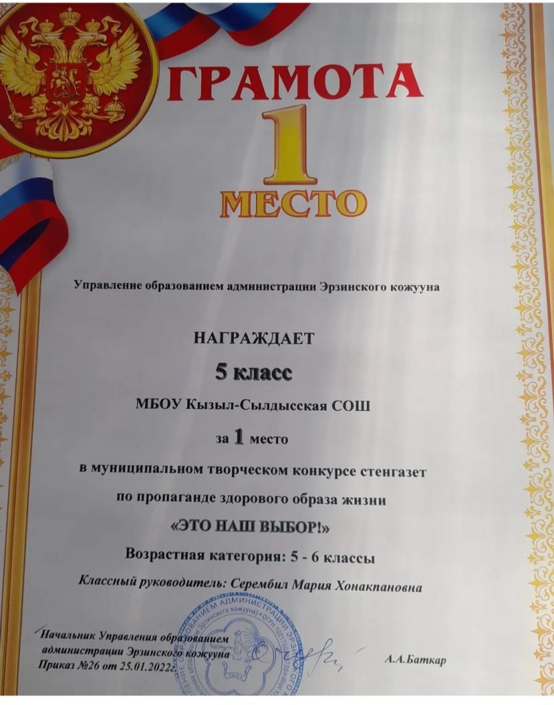 5 класс заняли 1 место в муниципальном творческом конкурсе стенгазет по пропаганде здорового образа жизни «ЭТО НАШ ВЫБОР!». Классный руководитель Серембил М.Х.