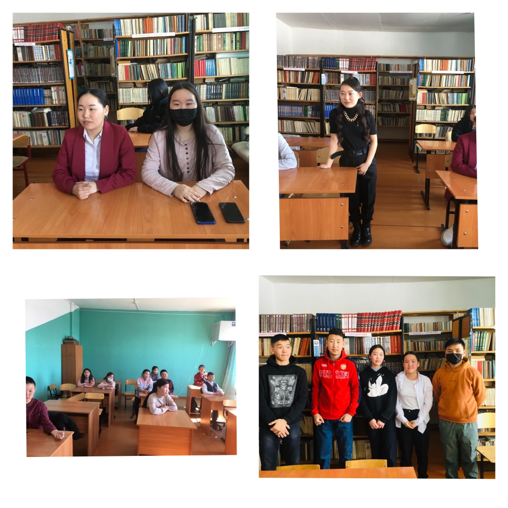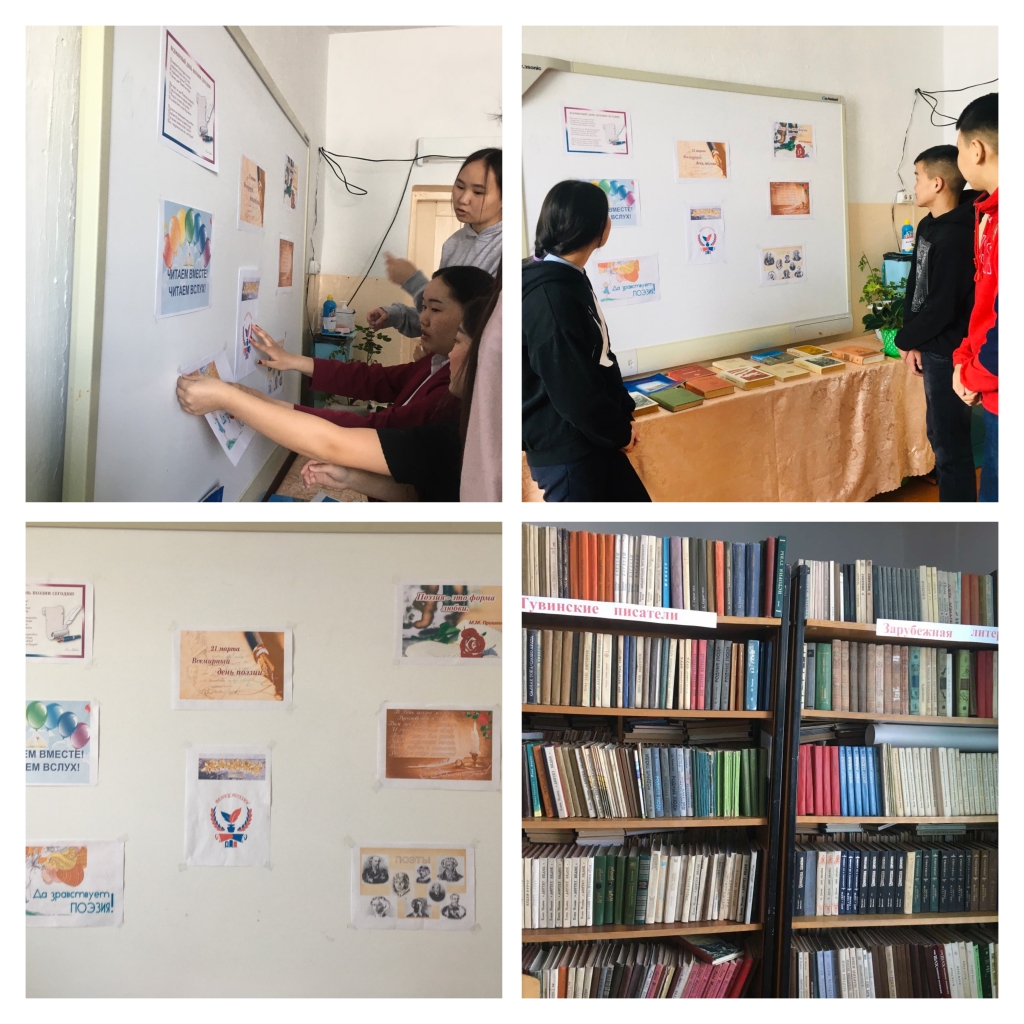 Цель — познакомить детей с Всемирным днём поэзии. Библиотекарь рассказала об истории празднования Всемирного дня поэзии. Старшеклассники зачитывали стихи любимых авторов,среди которых. С.Есенин,Ф.Тютчев,А.Пушкин,А.Фет,С.Сарыг-оола, Е.Танова, А. Даржай. В заключении мероприятия школьники приняли участие в викторине «Сказочная викторина», «Вспомни стихотворение».